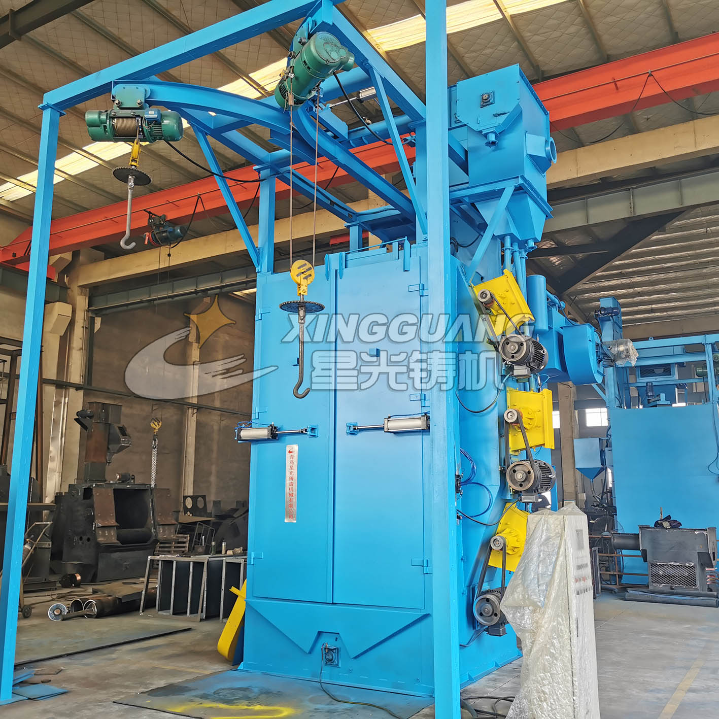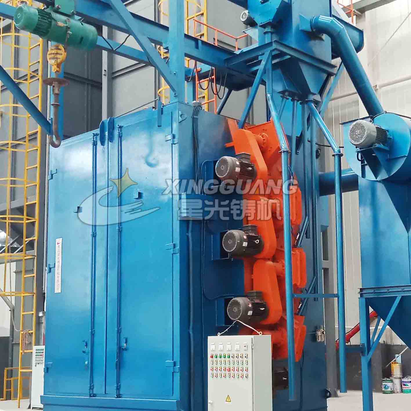 吊鉤式拋丸清理機具備拋丸量大、室體有效空間大、對鑄機外形機構無要求且參數定制靈活等顯著優勢。我司建議用戶選擇Q378以上機型時,由技術人員根據鑄件量身定做拋丸機室體尺寸,并由用戶根據自身生產情況自由選...…